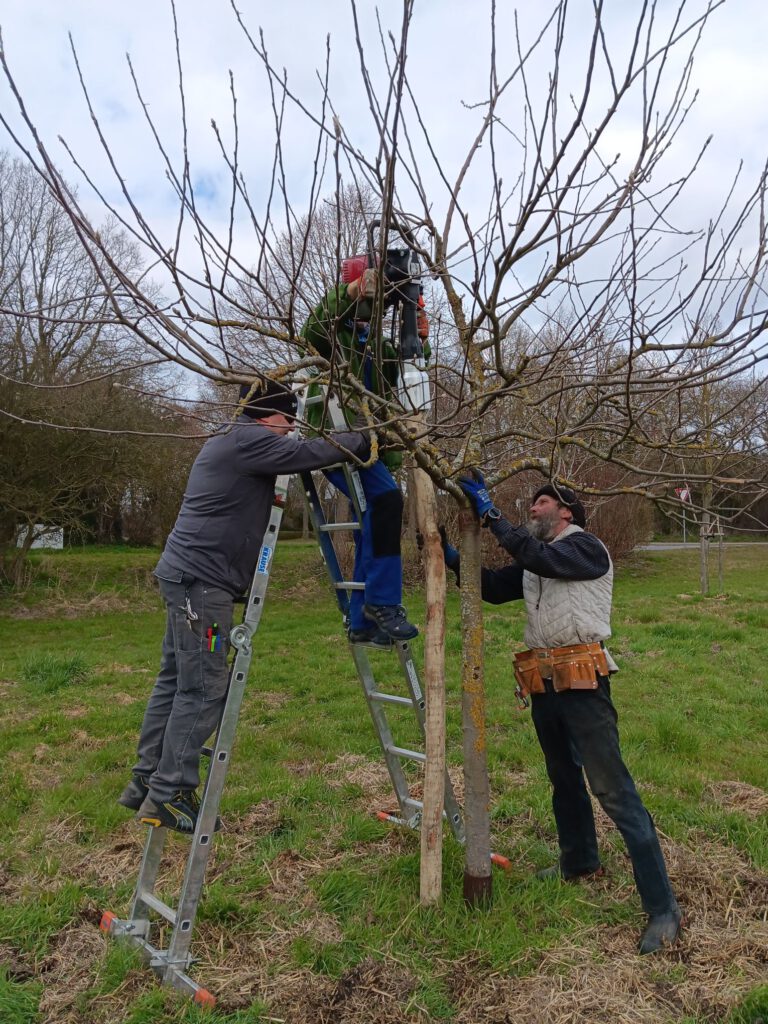 In den vergangenen Tagen rammten wir zusätzliche Haltepfähle, weil die Dreiböcke nach 6 Jahren im Boden verrottet sind. Dadurch verlängern wir die Haltbarkeit der Dreiböcke um ca. 3 Jahre. Dann werden unsere Hochstämme mit nur einem Robinienpfahl sicher stehen können.